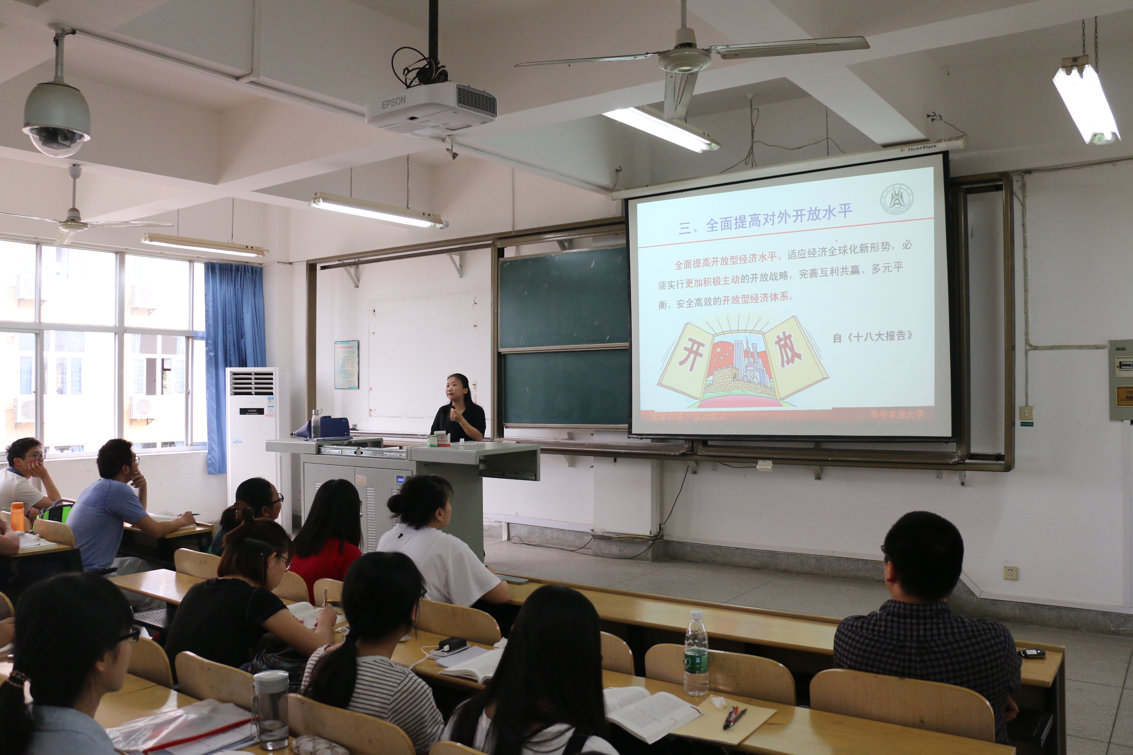 刘双老师从实施更为主动的开放战略、以开放促发展、提升中国话语权、树立安全观四个方面论述如何提高对外开放水平,她引用十八大报告、十八届五中全会、学术论文、以及世贸海关的精准数据和视频资料分析说明现今中国存在的问题及国家的发展形势和战略,并以全面提高对外开放水平对中国而言的意义,在对外贸易中如何进行供给侧结构改革,对外开放中存在哪些经济风险,利用外资是否越多越好等问题,与学生进行当堂讨论进行思考,调动课堂氛围并且把课程引向更深层次。