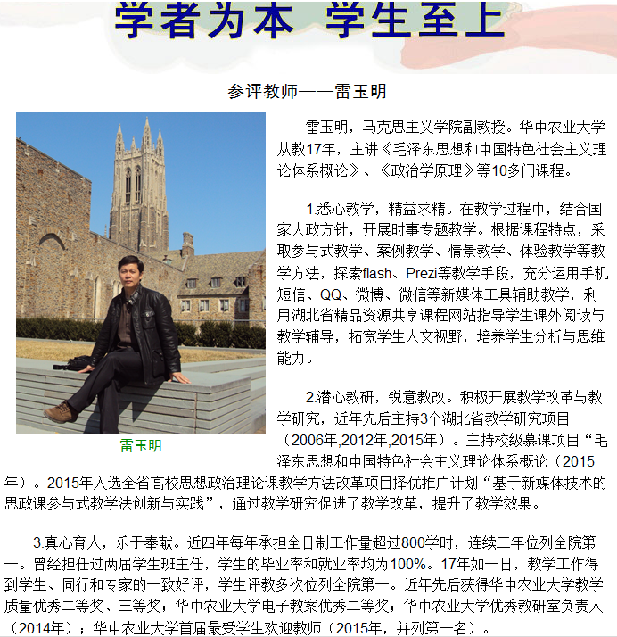 雷玉明,9428cn太阳集团副教授,2015年度学校最受欢迎教师之一。在17年的马克思主义理论教育生涯中,雷老师力求进讲义,教学资料注重时效性;进课堂,教学方法体现创新性;进头脑,课外教学探索拓展性,努力做学生的人生导师,塑造学生灵魂。雷老师在《毛泽东思想和中国特色社会主义理论体系概论》教学中,寓耕于读,塑造灵魂,充分利用现代信息技术,不断深化马克思主义中国化最新理论成果“三进”,努力促进“三入”。在课堂上尝试研讨教学、案例教学、动漫教学、Prezi教学和现场教学,让时政热点进讲义,进课堂;他积极利用网络媒体,微课、微信和QQ群辅助教学,让教学内容进头脑,正三观。在雷老师教学影响下,学业成绩名列本专业年级前10%的生命科学技术学院生物工程专业2010级学生肖迪主动申请推免保送到9428cn太阳集团攻读马克思主义中国化专业硕士研究生,成为师生佳话。