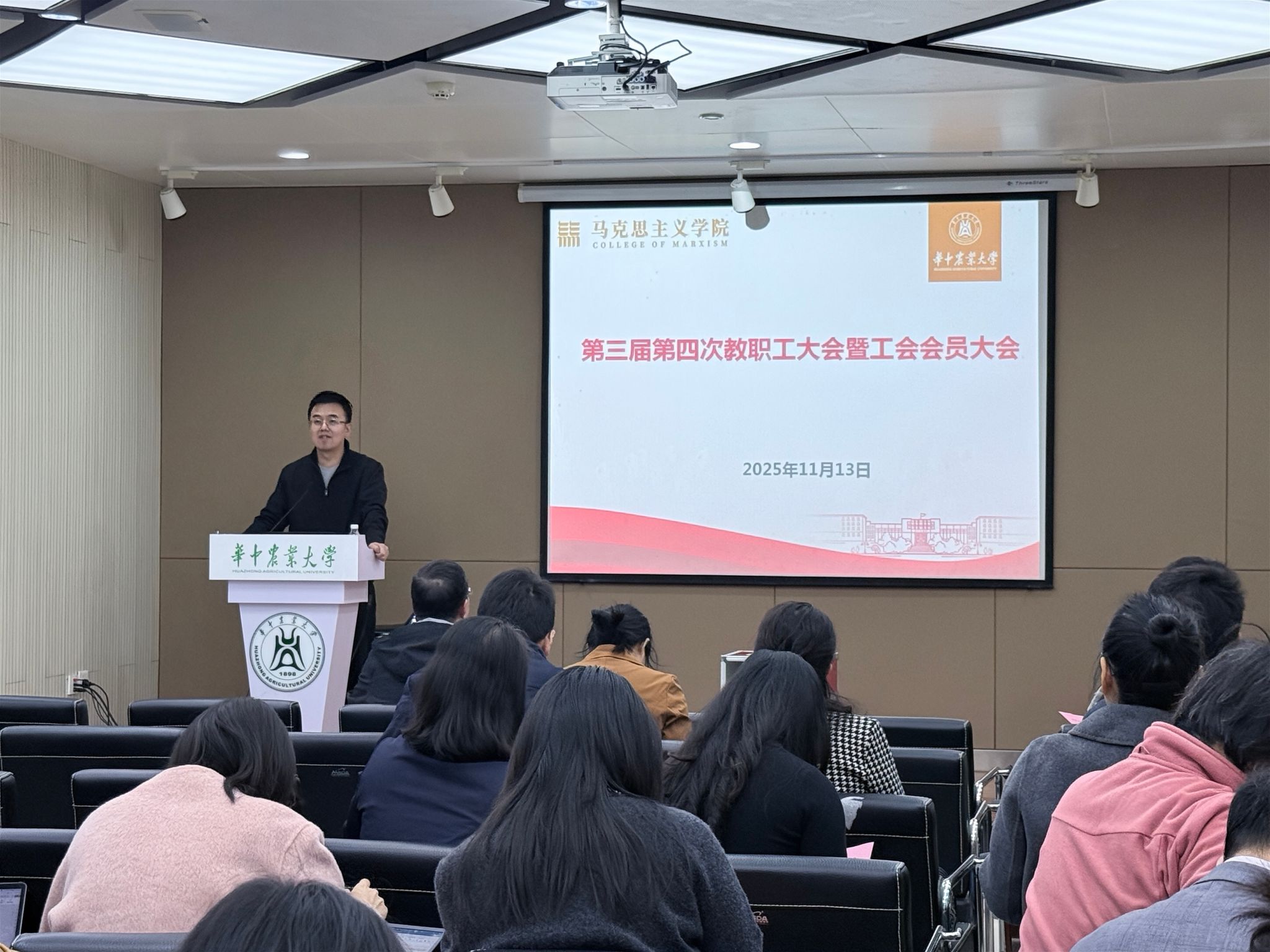 11月13日下午,马院第三届第四次教职工大会暨工会会员大会在创业楼121报告厅举行。本次会议以“规范民主程序,凝聚发展合力”为主题,学院全体教职工参加会议,大会由党委书记刘三宝主持。