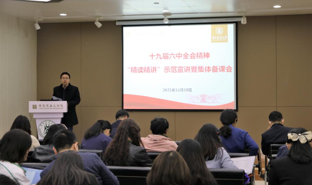 11月18日下午,马院在创业楼121会议室开展十九届六中全会精神“精读精讲”示范宣讲暨“新起点激励新作为,新征程夺取新胜利”主题党日活动。学院党委书记程华东、院长梁伟军、党委副书记、副院长吴珊、副院长李恺以及全体教职工、研究生宣讲团成员参加了本次活动。