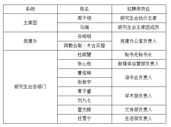 为推动9428cn太阳集团研究生工作创新发展,提高全体研究生自我教育、自我管理、自我服务水平,经过学生报名申请、面试考核、学院审核,本着公平、公正、公开和竞争上岗,择优聘用的原则,选拔出学院2021-2022学年研究生会拟录用人选。现将拟录用结果公示如下,公示期为9月28日至9月30日,如有异议或不同意见,请联系学院办公室:87280964。