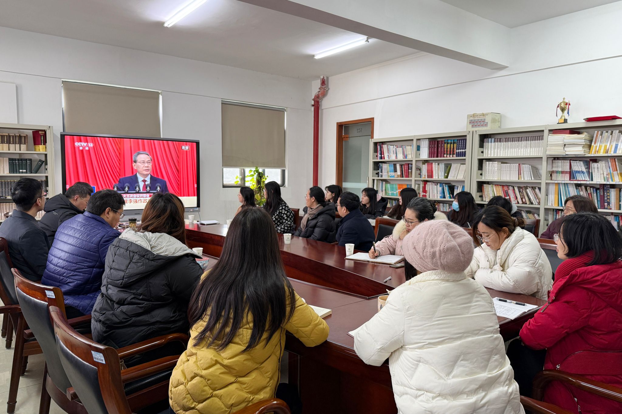 图书馆教职工收看直播(记者 徐行 摄)