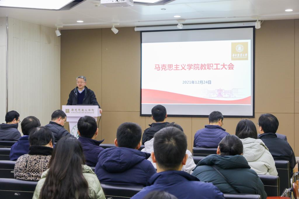 最后,廖济忠充分肯定了学院近一年的工作,学院各项事业发展稳中有进,呈现出新气象。他针对新班子建设和学院发展建设提了四个方面的要求,一要始终坚守立场,坚持“两个确立”,做到“两个维护”,坚持正确的政治立场;二要倍加珍惜“位置”,每一个“在位”的人,不要浪费位置,在其位者要堪其用;三要特别注重成效,用成效说话,马院的班子要对自己有更高的要求,要讲好、抓好思政课;四要不断修炼素质,素质是最可靠的支撑。同时,他还提到,做为领导班子要切实做到四点,一是遇事“如临深渊”,临事而惧,好谋而成;二是议事“如数家珍”,对情况要非常熟悉,能够提出建设性建议,拿出解决问题的方法;三是办事“如汤沃雪”,有效率有质量;四是共事“如坐春风”,做到团结向上,心情舒畅,有情有义。最后,他勉励全体思政课教师要怀抱更高追求,保持良好状态,做立德树人的大事业,做追求卓越的大学问,做学高身正的大先生。