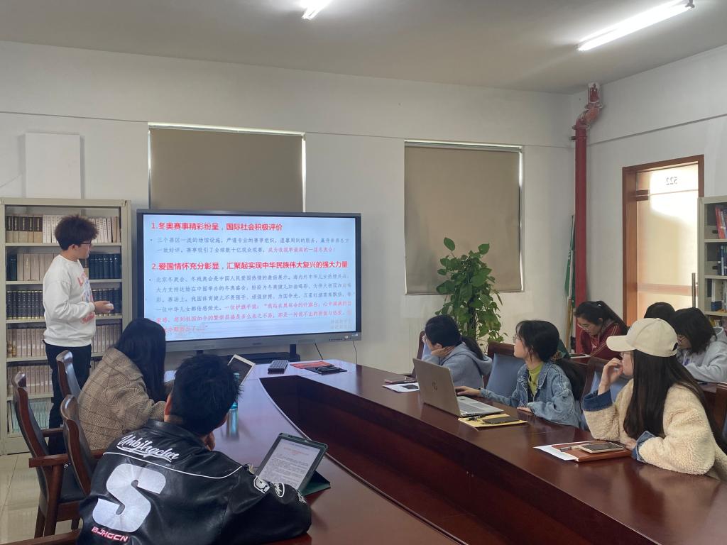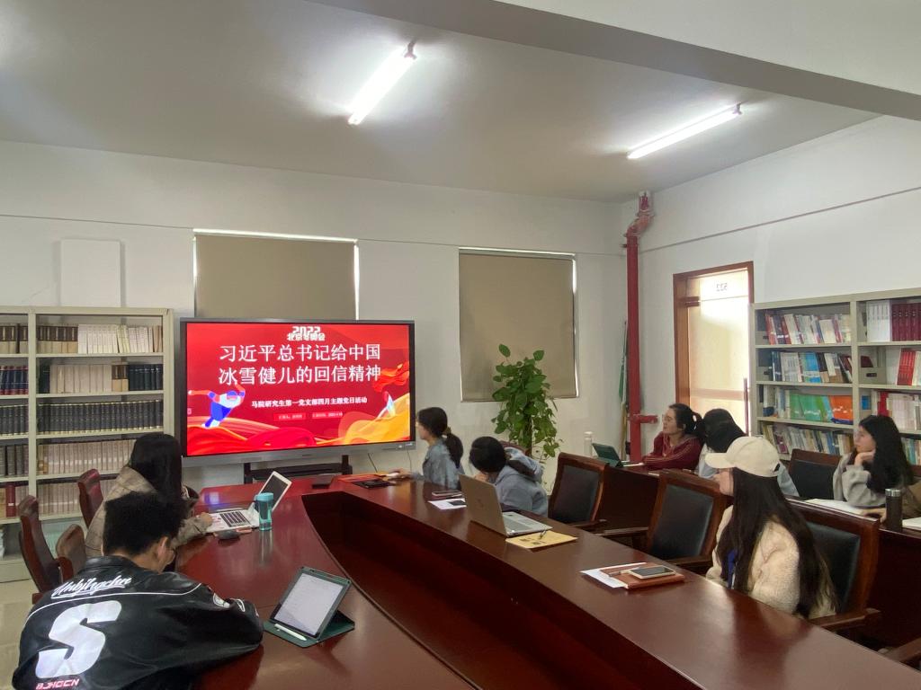 (支部成员孙明明同志领学习近平总书记给中国冰雪健儿的回信精神 黄子睿摄)