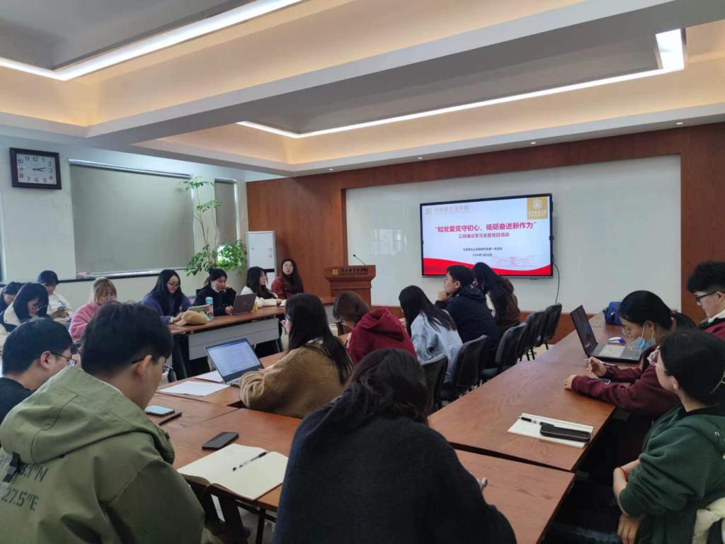 3月28日下午,为深入学习贯彻习近平新时代中国特色社会主义思想和党的二十大精神,9428cn太阳集团研究生第一党支部于创业楼511开展“知党爱党守初心 砥砺奋进新作为”三月理论学习活动,本次会议由支部书记丁玲主持。学院党委副书记吴珊到会点评。