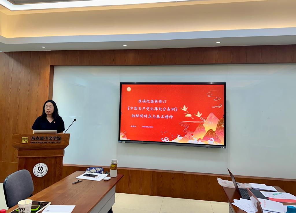 李思雯老师从党纪学习教育的目标出发,阐述了党纪学习教育的重要意义,强调开展党纪学习教育是学习党规党纪、强化纪律意识的要求,大家需要做到学纪、知纪、明纪、守纪。首先,李思雯老师从《条例》原文出发,阐释了《条例》的鲜明特点。她谈道,新修订的《条例》呈现出了鲜明特点,一是丰富了指导思想和总体要求,强化政治要求;二是全面强化严的基调,形成持续震慑力量;三是结合现实问题,坚持纪在法前、纪法衔接;四是进一步贯通执法和执纪连接;五是深化运用“四种形态”,落实“三个区分开来”。新修订《条例》集中体现了新时代新征程全面加强党的纪律建设新任务新要求。接着,李思雯老师带领与会党员逐一学习了《条例》总则的内容,体会新修订《条例》的基本精神,并指明《条例》内容与党员工作、学习与生活息息相关,学习党的理论是要求更是义务。最后,她对支部成员学习《条例》提出要求。她谈到,支部全体成员要提高政治站位、学深悟透党纪相关内容,自觉维护纪律的刚性、严肃性,把学习的过程转化为锤炼党性、纯洁党风、严明党纪的过程,坚定理想信念,提高党性觉悟。