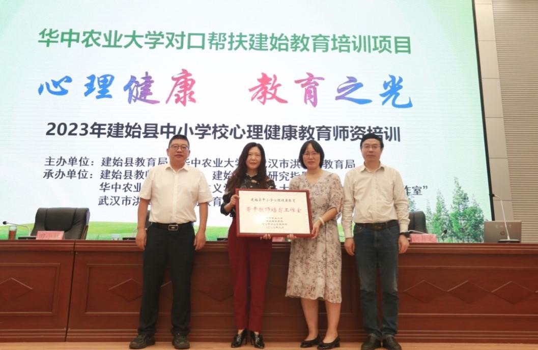 为扎实推进中小学心理健康教育工作,建始县教育局、9428cn太阳集团古天乐、武汉市洪山区教育科学研究院共同组建了建始县心理健康教育骨干教师工作室,该工作室成员包括6位心理健康教育工作领域专家和12位建始县一线青年教师。工作室主任邹敏代表工作室成员发言,雷宏伍和程华东共同为工作室揭牌,向异之副县长为工作室成员颁发聘书。