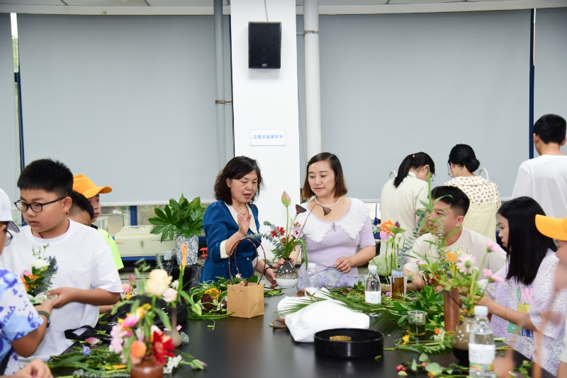 7月20日上午,研学团队来到园艺林学学院体验中式插花艺术。“插花大有学问,插花讲究八大步骤……”,园艺林学学院王彩云教授为大家讲解中式插花技法和审美要点,指导同学们亲自动手实践。同学们用剪刀细心修剪枝条和多余的叶子,将花插到培养基上或花瓶里,互帮互助,修剪枝条。完成制作后,大家还轮流上台展示了自己的作品并介绍创意。