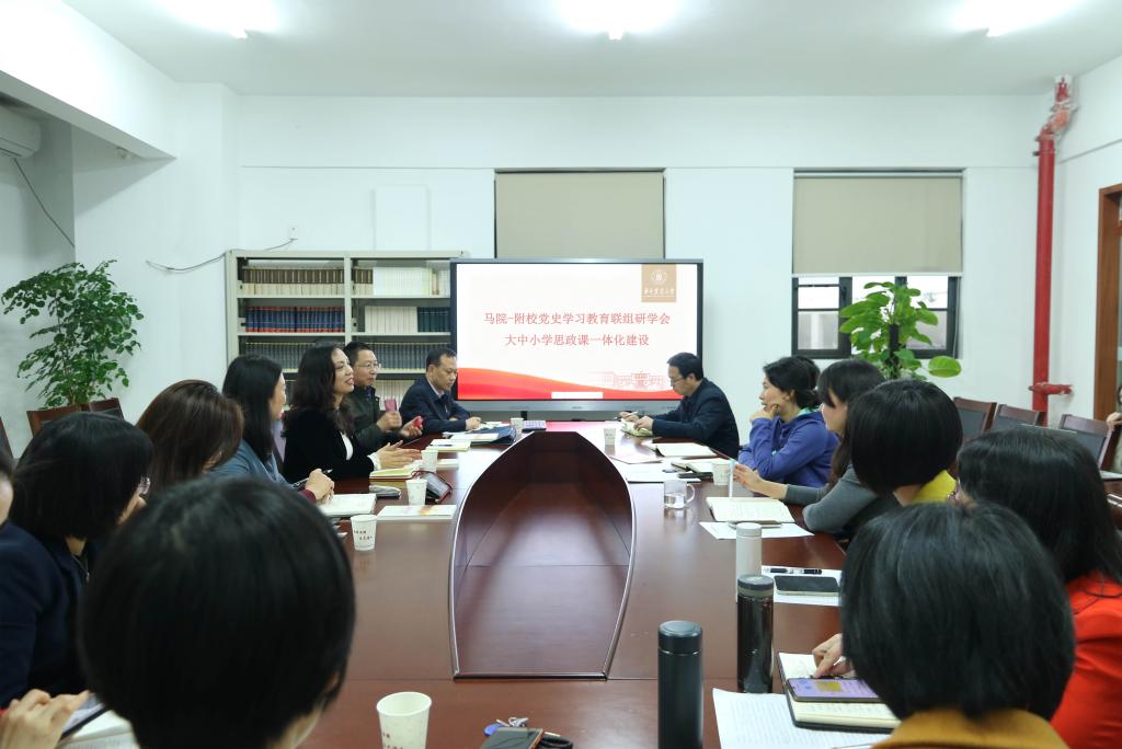 余敏、李华分析了当前附校开展思政课教育教学面临的形势、任务和问题,提出了联合开展集体备课、加强心理健康教育、共同开展课题研究、创新思政教育活动形式等方面的需求。与会马院思政课教师结合学院思政课教育教学工作,针对附校提出的问题和需求,进行了交流和研讨。李凤兰教授提出,建议建立中小学思政课一体化工作联盟,进一步做到明确目标一体化、资源共享一体化。田甜副教授谈到,要发挥双方优势和特色,加强组织联动、课题联动、队伍联动、平台联动,共同做好立德树人工作。唐尚书老师围绕实践育人,提出要发挥马院研究生作用,调动中小学生积极性,推进大中小学思政课一体化、系列化、常态化、品牌化。
