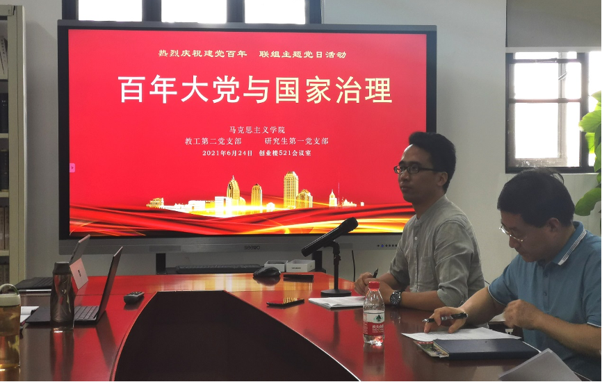 6月24日,马院教工第二党支部与研究生第一党支部在创业楼521办公室举办“百年大党与国家治理”联组主题党日活动。本次活动由教工第二党支部书记陈明老师主持,江丽、陈帅和孔浩三位老师给全体党员做了三场精彩的报告。