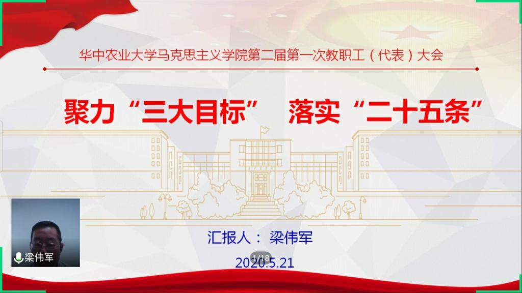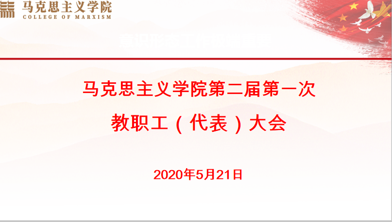 2020年5月21日,学院第二届第一次教职工(代表)大会在线上通过腾讯会议顺利召开。本次会议的主题是“聚力‘三大目标’,落实‘二十五条’”,校党委副书记、纪委书记廖济忠、校工会常务副主席陈昉源以及学院全体教职工参加会议。
