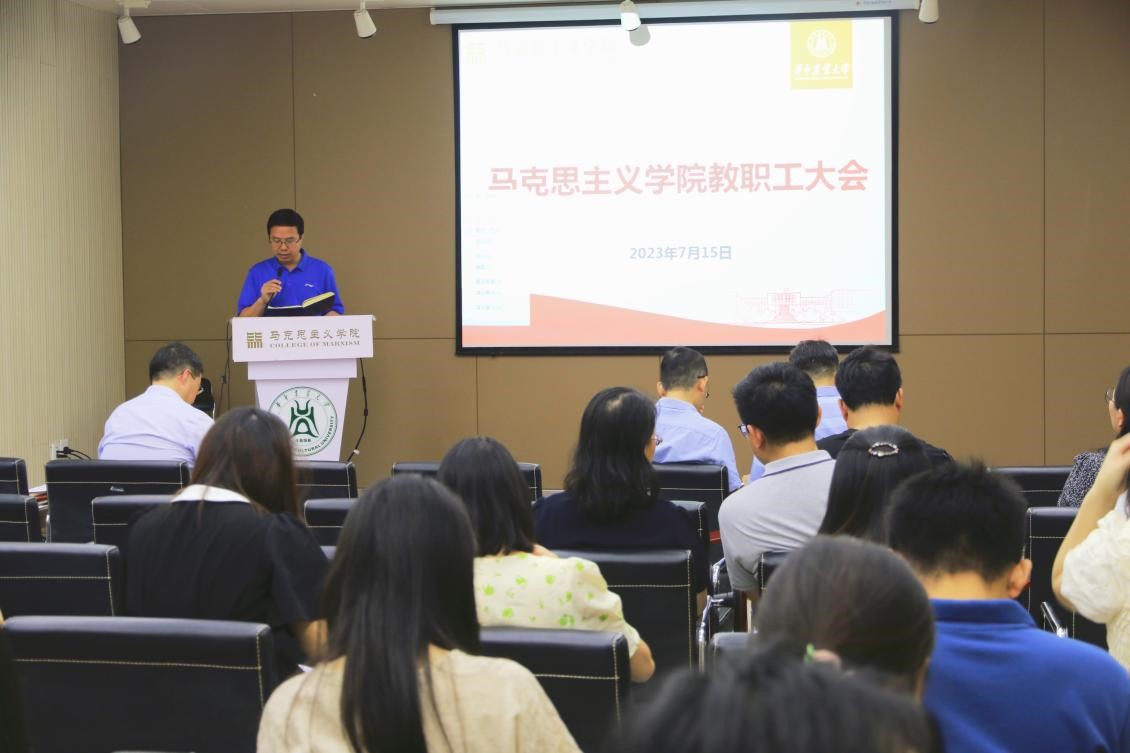 会议对暑期主题教育、思政教师研修、社会实践、科研课题申报、教学质量奖培育、安全稳定、研究生始业教育、入学教育及论文指导等多项工作进行了安排和部署。学院院长梁伟军强调,要做好暑期社会实践工作,提前做好方案策划,通过集体研修的方式来提高教学能力、优化教学方式、增强课堂的艺术性和吸引力;要加强科研课题研究,积极申报各级各类课题,成果足够的项目要提前做好结题准备;研究生导师要密切关注学生论文完成进度和质量,并及时给予相应的指导;要充分利用好暑期时间,加强科研能力、提高业务水平,为下学期各项工作顺利开展做足准备。程华东提出,暑期是静心研学的好时机,全院教职工要结合学校要求做好“四个一”:一是“学”,结合主题教育总要求,静下心来集中研学习近平新时代中国特色社会主义思想及总书记系列重要讲话精神;二是“践”,结合思政课建设要求,以系为单位,组织参加一次有意义、有体悟、有收获的暑期研修活动;三是“思”,结合学校教育思想大讨论,利用假期进行一次认真的教学反思;四是“研”,坚持以教学助力学术、以学术支撑教学,进行一次认真的研究工作盘点,做好课题申报。