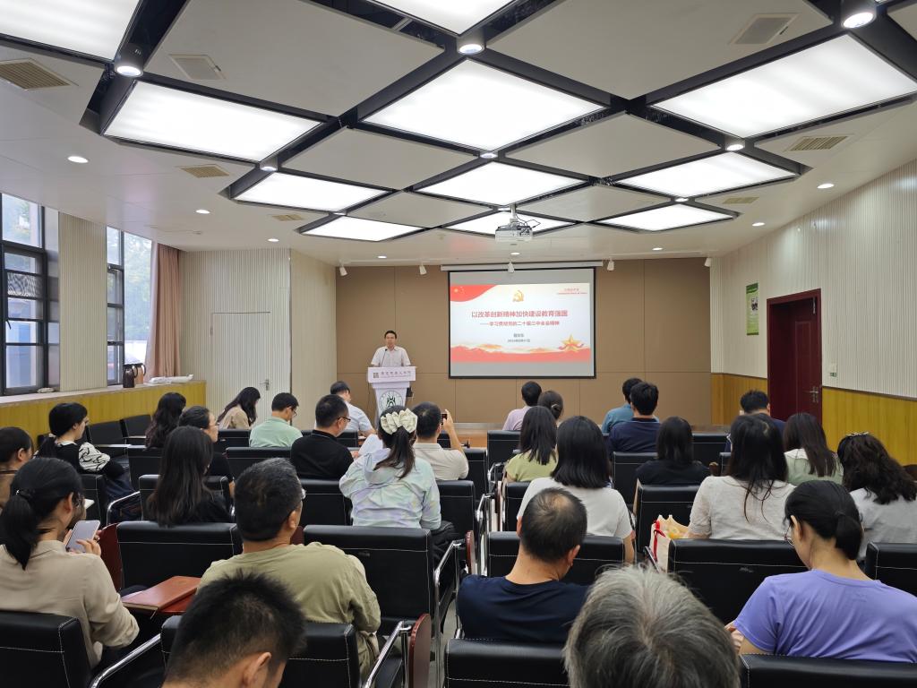 学院党委书记程华东聚焦党的二十届三中全会精神,结合《中共中央国务院关于弘扬教育家精神加强新时代高素质专业化教师队伍建设的意见》,以“改革创新精神加快建设教育强国”为题面向全院教职工作专题辅导报告。在报告中,他从“政治宣言,新征程中国式现代化‘动员令’;实践续篇,新时代全面深化改革‘成绩单’;时代新篇,进一步全面深化改革‘路线图’;综合改革,加快建设教育强国‘强引擎’”等四个方面,对党的二十届三中全会精神、党的二十大“教育新论述”等进行了分析解读,对加强思政课教育教学改革,强化师德师风建设进行了安排部署。他强调,我们要全面、系统、深入学习习近平新时代中国特色社会主义思想和党的二十届三中全会精神,进一步深化学习习近平总书记关于教育的重要论述和重要指示批示精神,全面准确把握丰富内涵和精髓要义,转化为建设教育强国、建设中华民族现代文明的强大动力、坚定信心,奋力答好“强国建设、教育何为”时代课题,加快推进教育现代化,以教育之力厚植人民幸福之本,以教育之强夯实国家富强之基,为全面推进中华民族伟大复兴提供有力支撑。